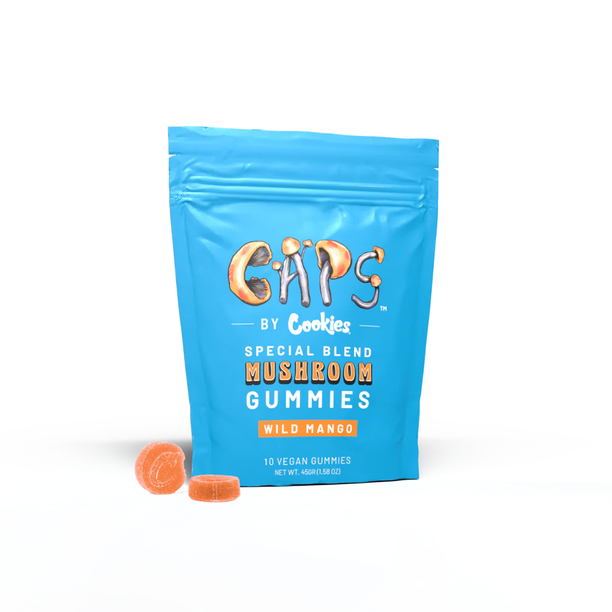 Caps by Cookies – Special Blend Mushroom Gummies Flavor: Wild Mango 10 Vegan Gummies | Net Wt. 45g (1.58 oz) Experience a flavorful fusion of wellness and taste with Caps...